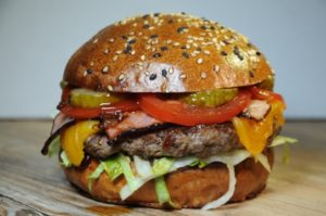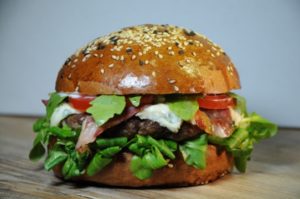 160g hovězího Chuck-roll,vypečená slanina,chedar,ledový salát,grilované rajče,kyselá okurka,bbq dressing,karamelizovaná cibule, 160g