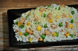 Varianta A-s kuřecím masem a sýrem smet., rýže, kukuřice, hrášek, kuřecí maso, eidam