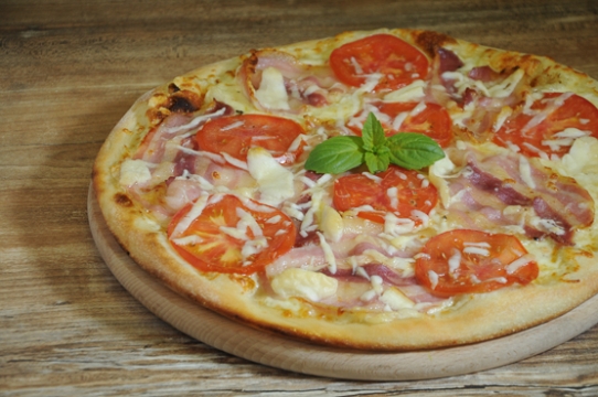 tomat, mozzarella, pancetta, rajčata, pecorino, bazalka