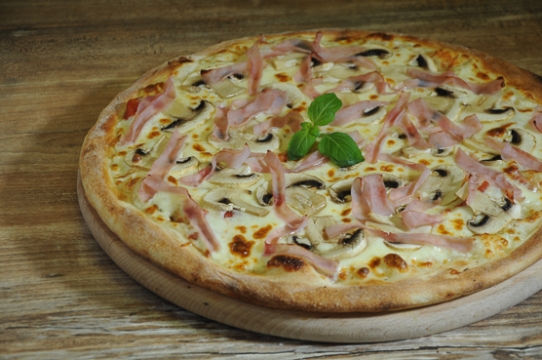 tomat, mozzarella, šunka, žampiony, bazalka