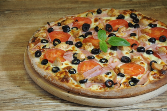 tomat, mozzarella, šunka, olivy, rajče, dvojitá porce kuřecího masa
