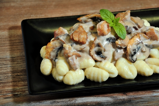 gnocchi, smetana, kuřecí maso, žampióny, om. z hříbků a zěřinového koření