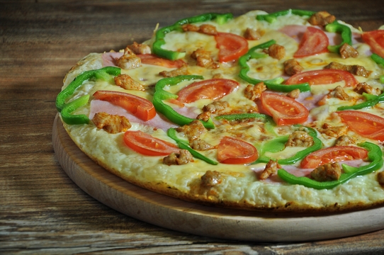 tomat, eidam, šunka, paprika, ementál, rajče, kuřecí a vepřové maso, česnek