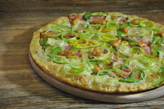 smetanový základ, eidam, anglická, paprika, hermelín, kuřecí maso, pórek, bazalka