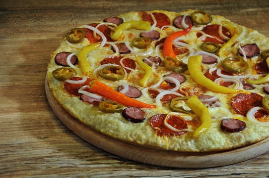 tomat, eidam, paprikáš, klobása, kozí rohy, cibule, feferony