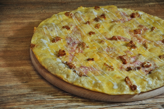 smetanový základ, eidam, šunka, anglická, ementál, uzený sýr, dvojitá porce vepřového masa, bazalka