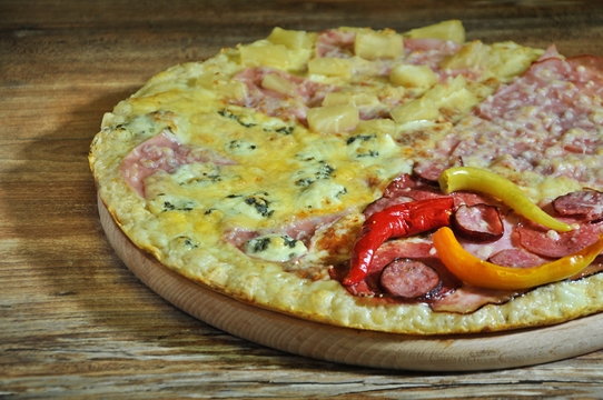 tomat, eidam, šunka, paprika, ementál, rajče, kuřecí a vepřové maso, česnek
