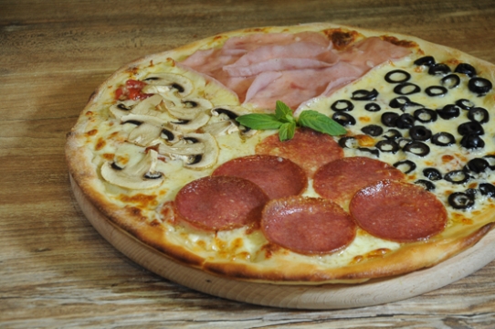 tomat, mozzarella, 1/4 herkules, 1/4 šunka, 1/4 žampiony, 1/4 olivy, bazalka